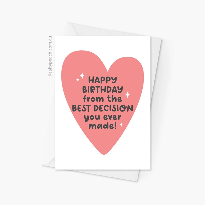 Choose whether to send this funny Best Decision Birthday Card directly to you or the recipient. Please select the appropriate option and enter their address during checkout, otherwise it will be sent to you. We can also add a personalised message on the inside (typed, not handwritten) at no extra charge.