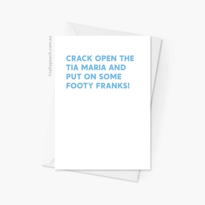 Celebrate in true Kath and Kim style with this hilarious greeting card! Featuring the iconic phrase, “Crack open the Tia Maria and put on some footy franks!” this card is perfect for anyone who loves Aussie humour. For a touch of Kath and Kim flair, grab this for a Birthday, New Baby, Engagement, Mother’s Day, Father’s Day, or as a Congratulations card!