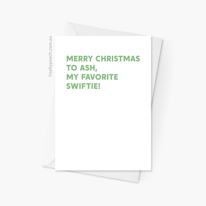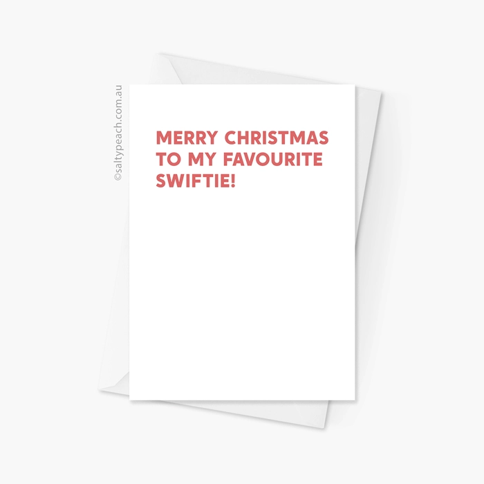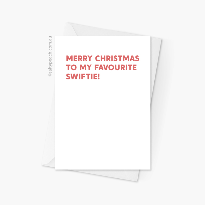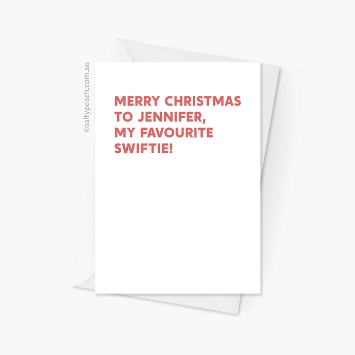 Choose whether to send this Favourite Swiftie Christmas card directly to you or the recipient. Please select the appropriate option and enter their address during checkout, otherwise it will be sent to you. We can also add a personalised message on the inside (typed, not handwritten) at no extra charge. “Favorite” spelling also available.