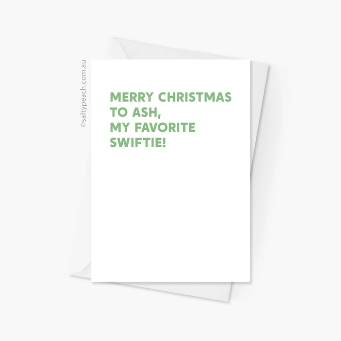 Merry Christmas to my favourite Swiftie! Celebrate the Holidays with this festive Christmas card for the Swiftie in your life! The perfect way to spread holiday cheer with a touch of pop star sparkle. Choose from red or green text. Personalise this card with the recipient’s name – please include this in the ‘personalisation’ section before adding to your cart. See images for examples.